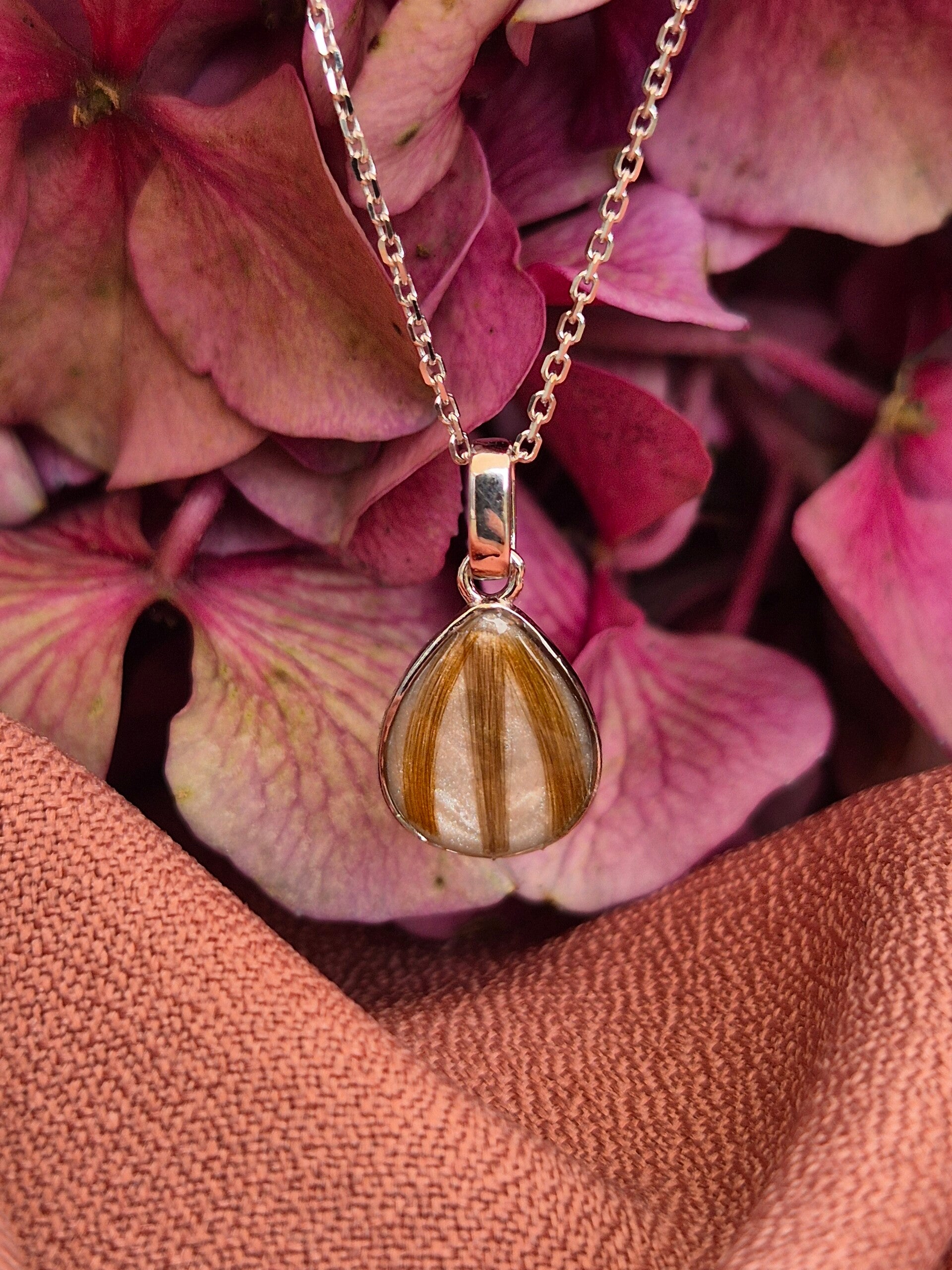 Op foto 3 & 4 is de hanger gevuld met wit parelmoerpigment op de achtergrond en zijn 3 verschillende haarlokjes in gelegd. Druppel maat is 8x10mm.