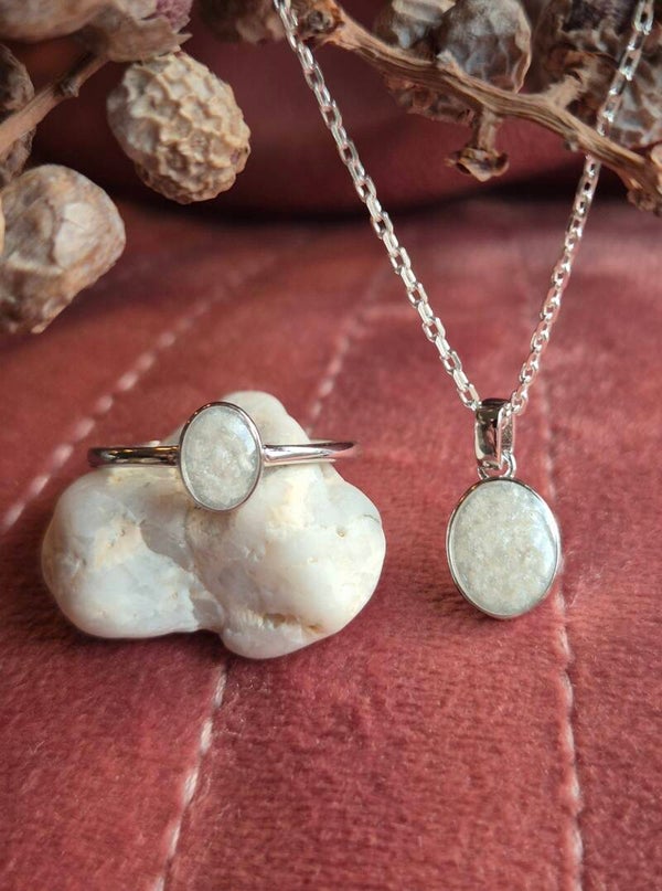 Foto 5 Hanger ovaal 6x8mm met crematie-as in wit parelmoer gelegd.