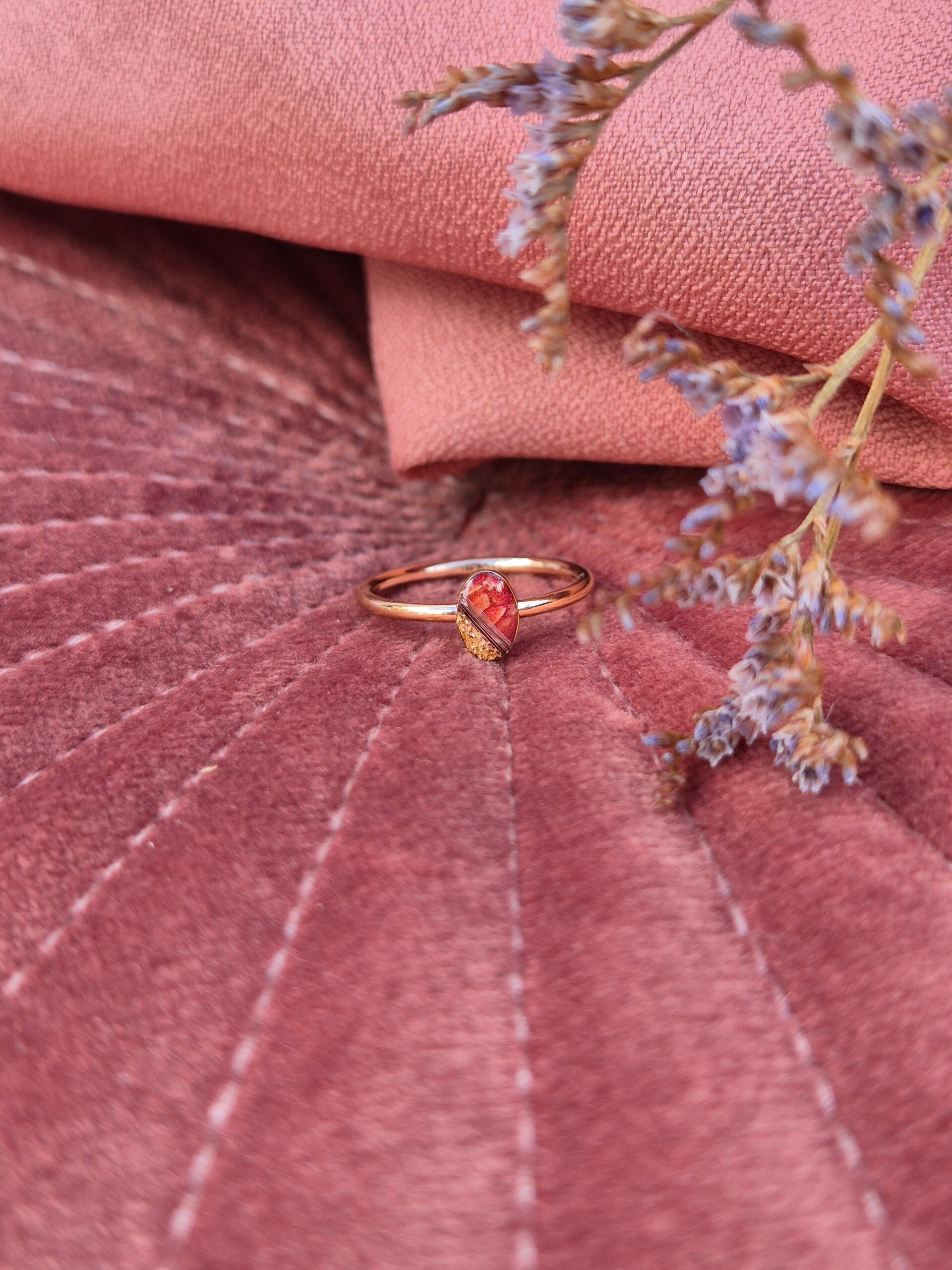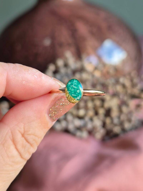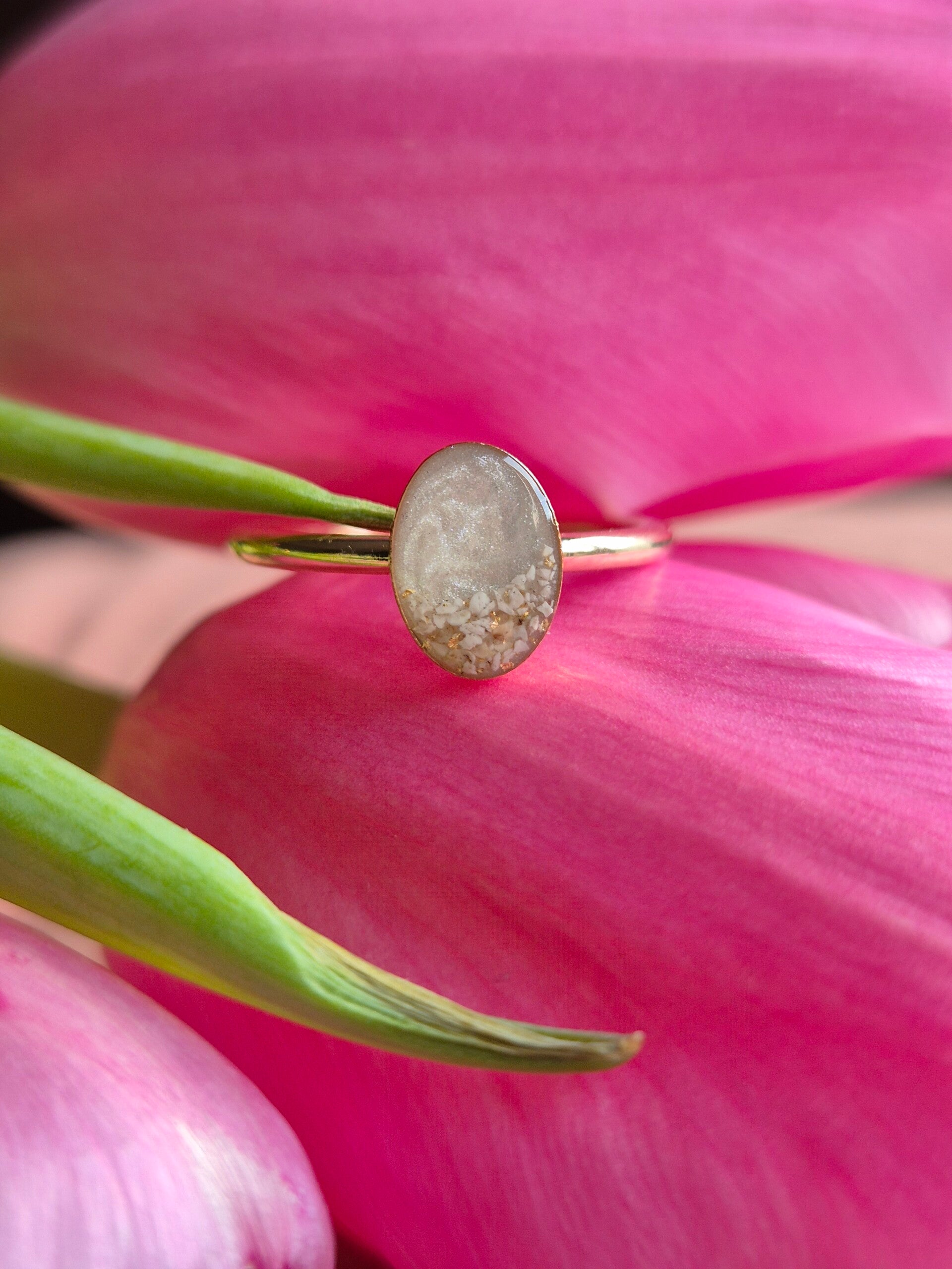 De ring op foto 1 en 2 is gevuld met crematie-as vermengd met groen parelmoer en goudvlokjes in de maten 4x6mm en 6x8mm