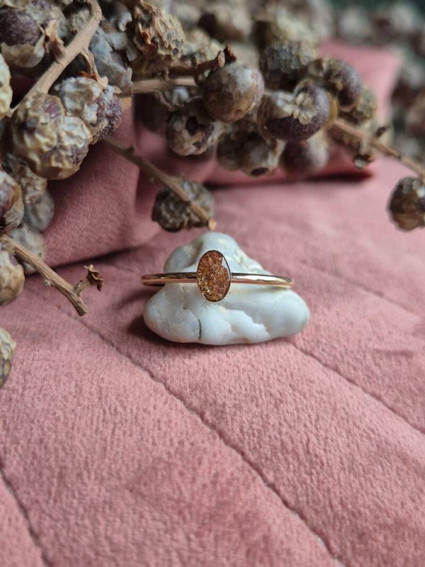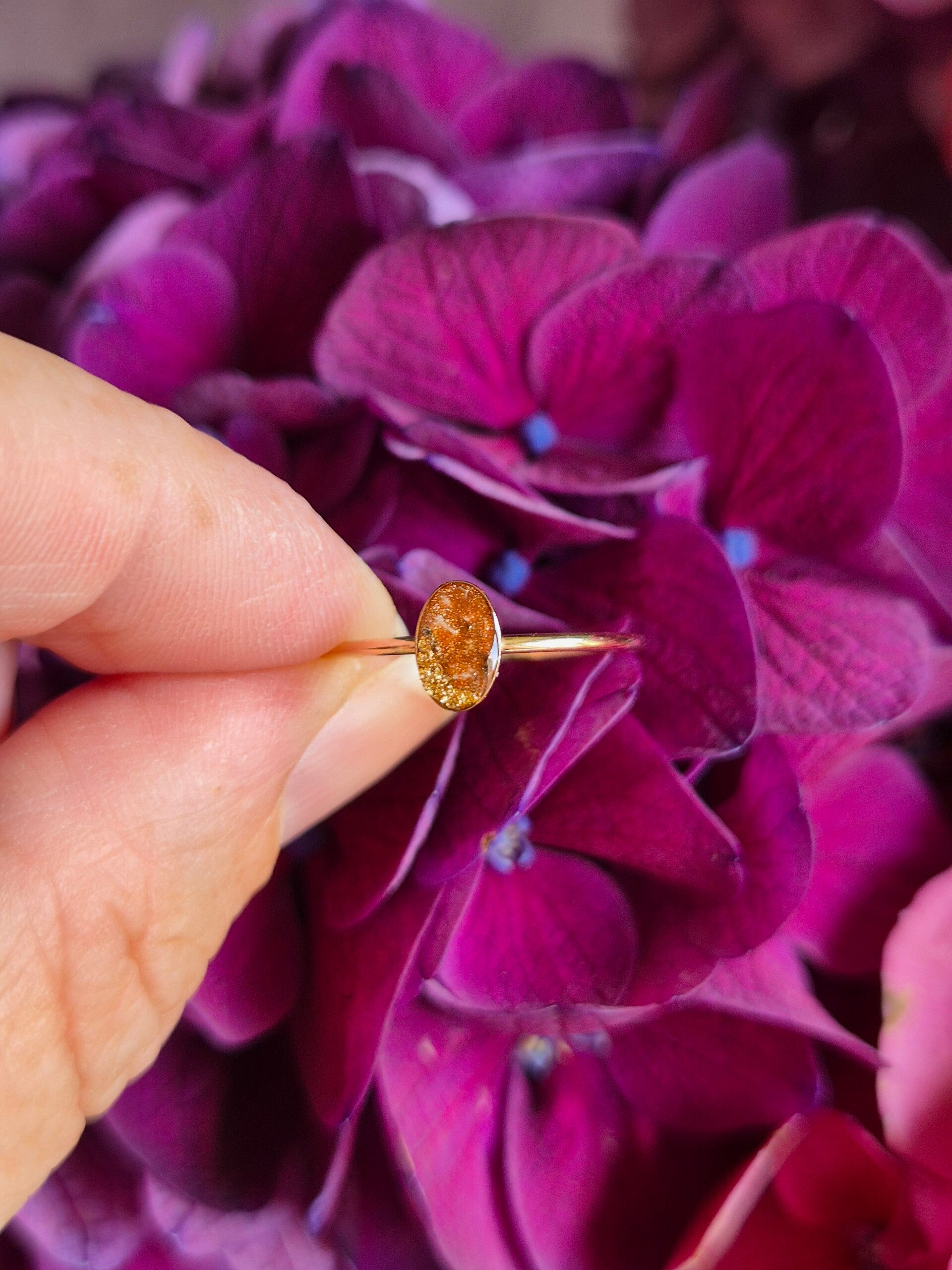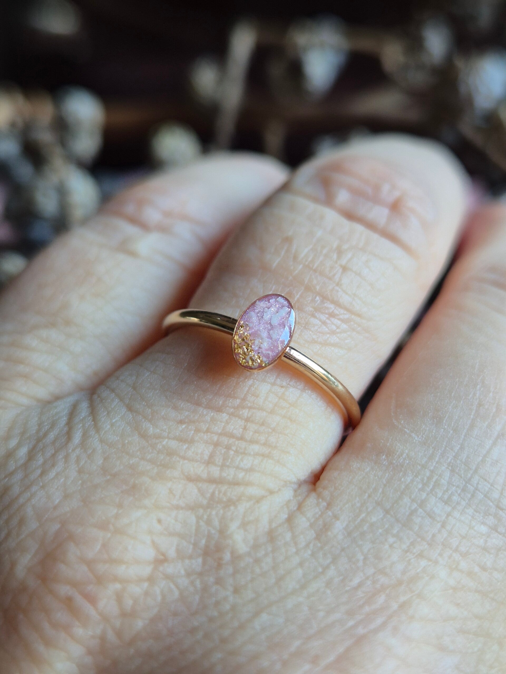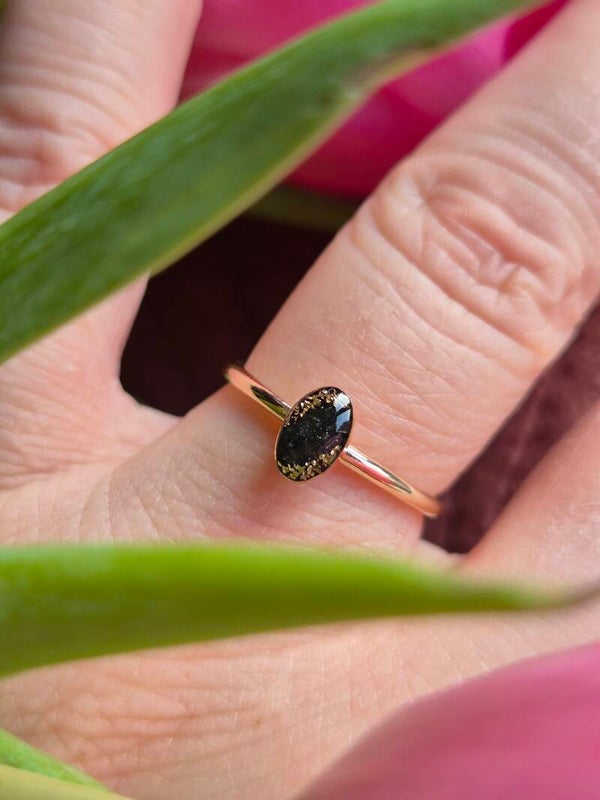 Foto 18 4x6mm zwart parelmoerpigment met daaron crematie-as gelegd (is maar heel licht zichtbaar) de goudvlokjes zijn in deze ring aan beide kanten van de ovaal ingelegd ♥