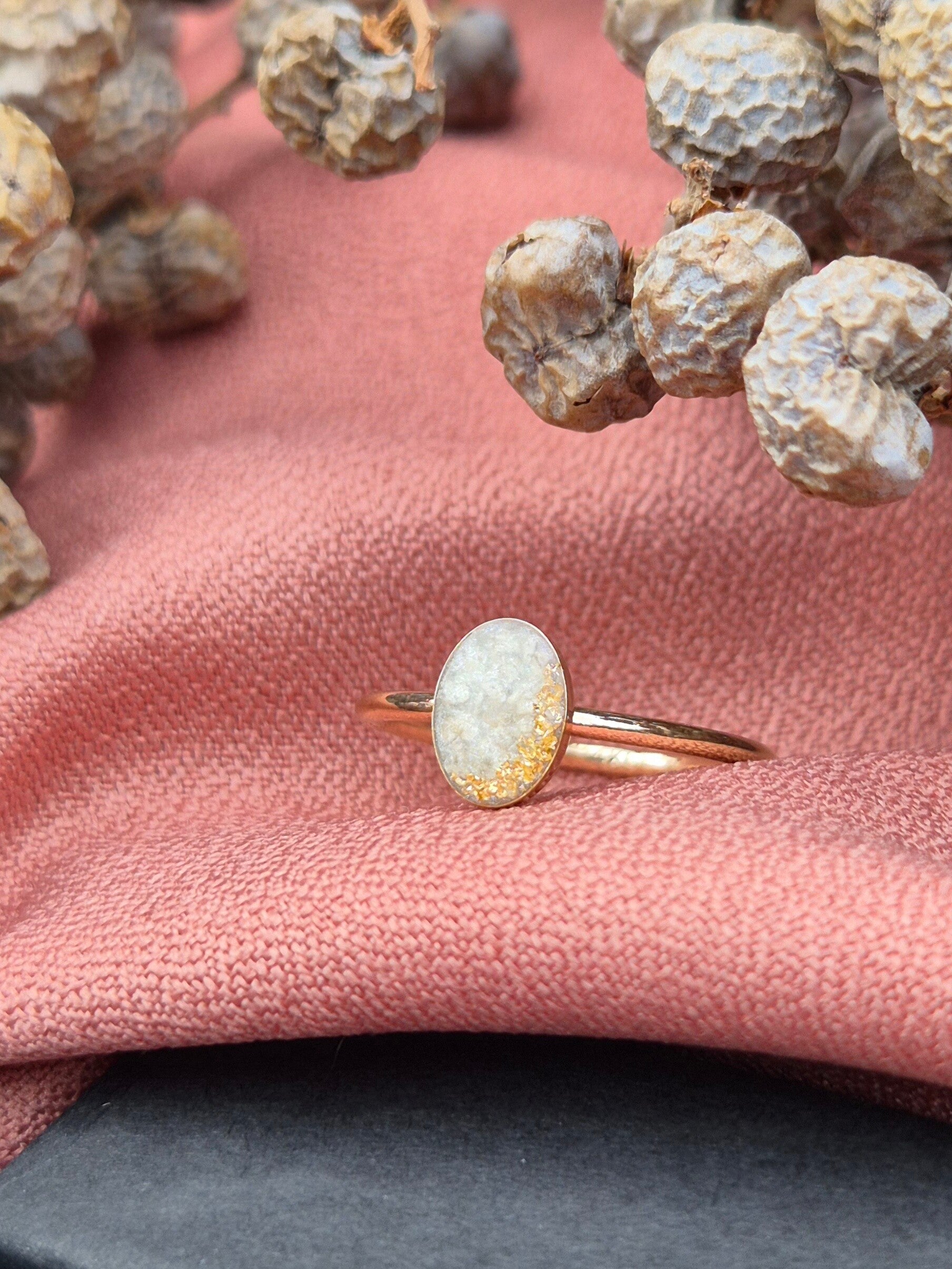 Foto 3 is maat 8x10mm en gevuld met wit parelmoer en witte delen crematie-as. De goudvlokjes zijn als een maantje in de ring gelegd.