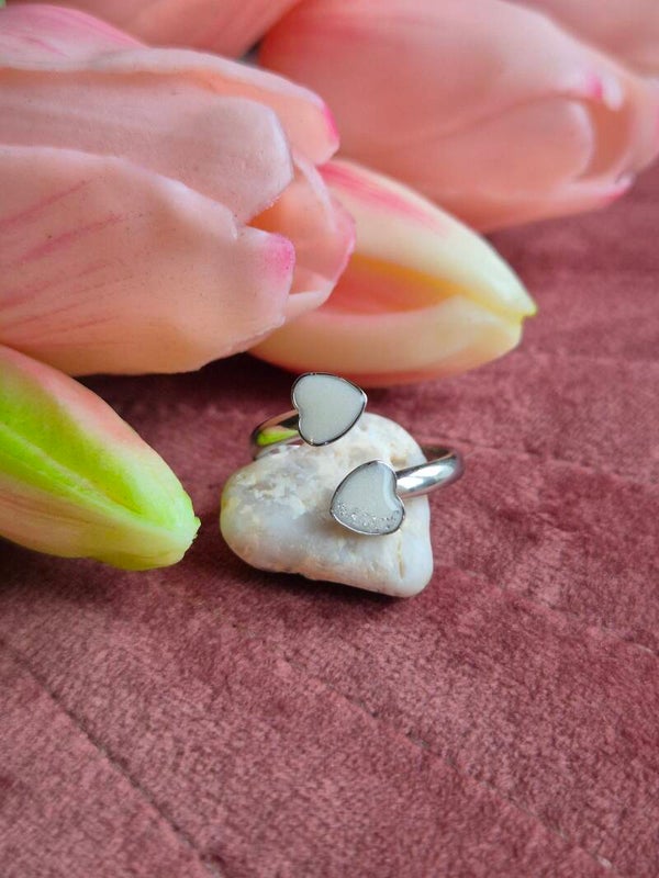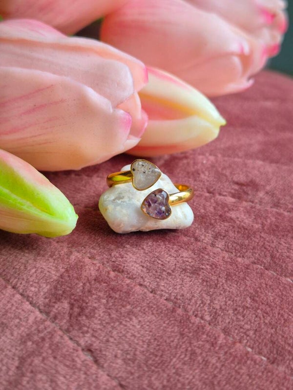 Foto 1 & 2 Rvs vergulde ring met in het bovendste hartje crematie-as op de voorgrond ingelegd, de gekozen achtergrond is wit parelmoer. Het onderste hartje bevat geboortesteen Amethist (fijngemaakt als achtergrond) en crematie-as daarbovenop gelegd.