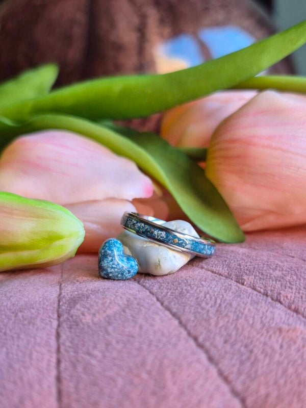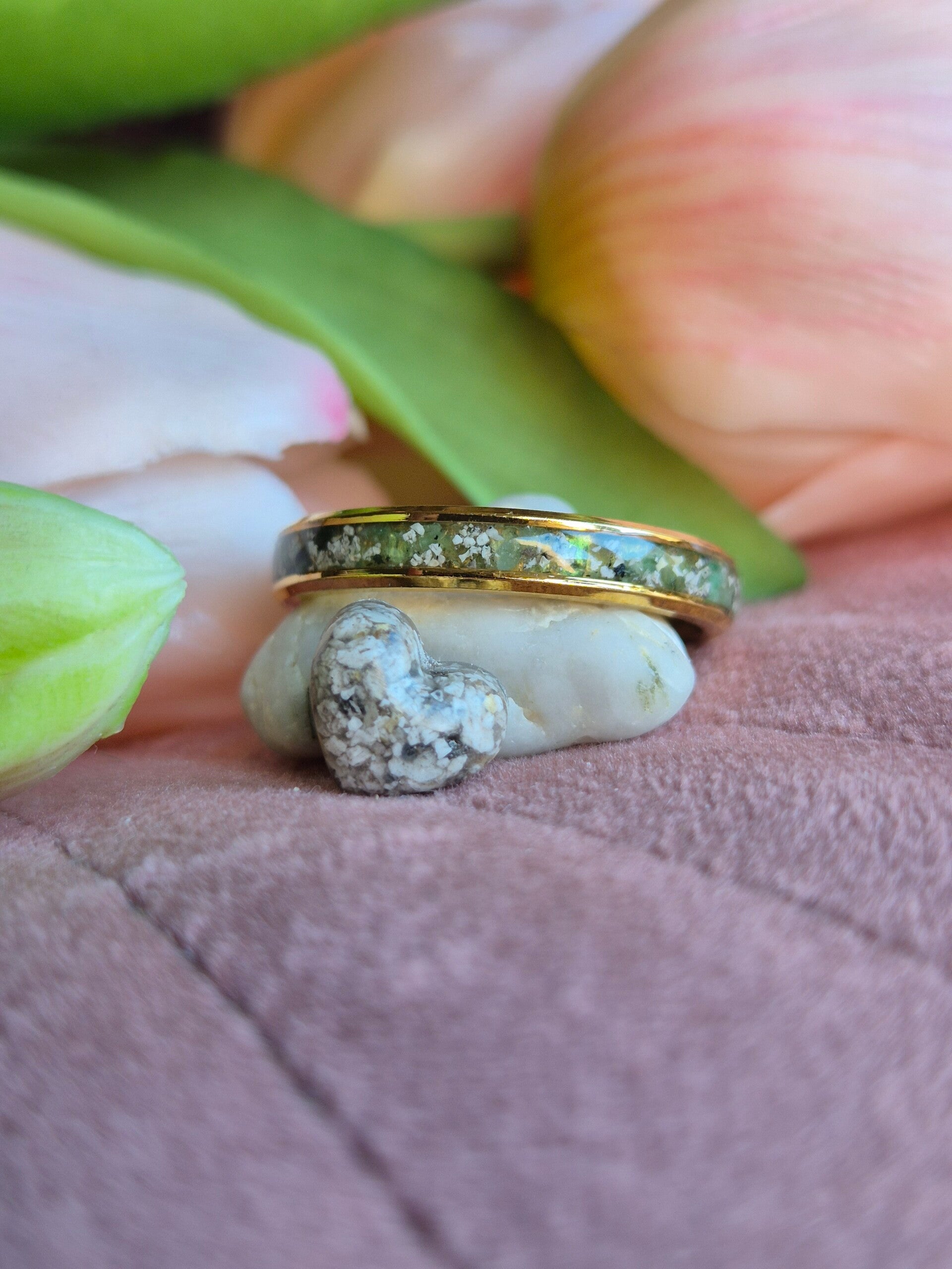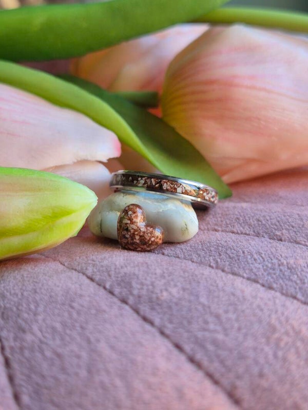 Foto's 4 en 5 hebben crematie-as met wit parelmoer gemengd, dit is maar subtiel zichtbaar i.v.m. de nabewerking die de bandring nodig heeft.