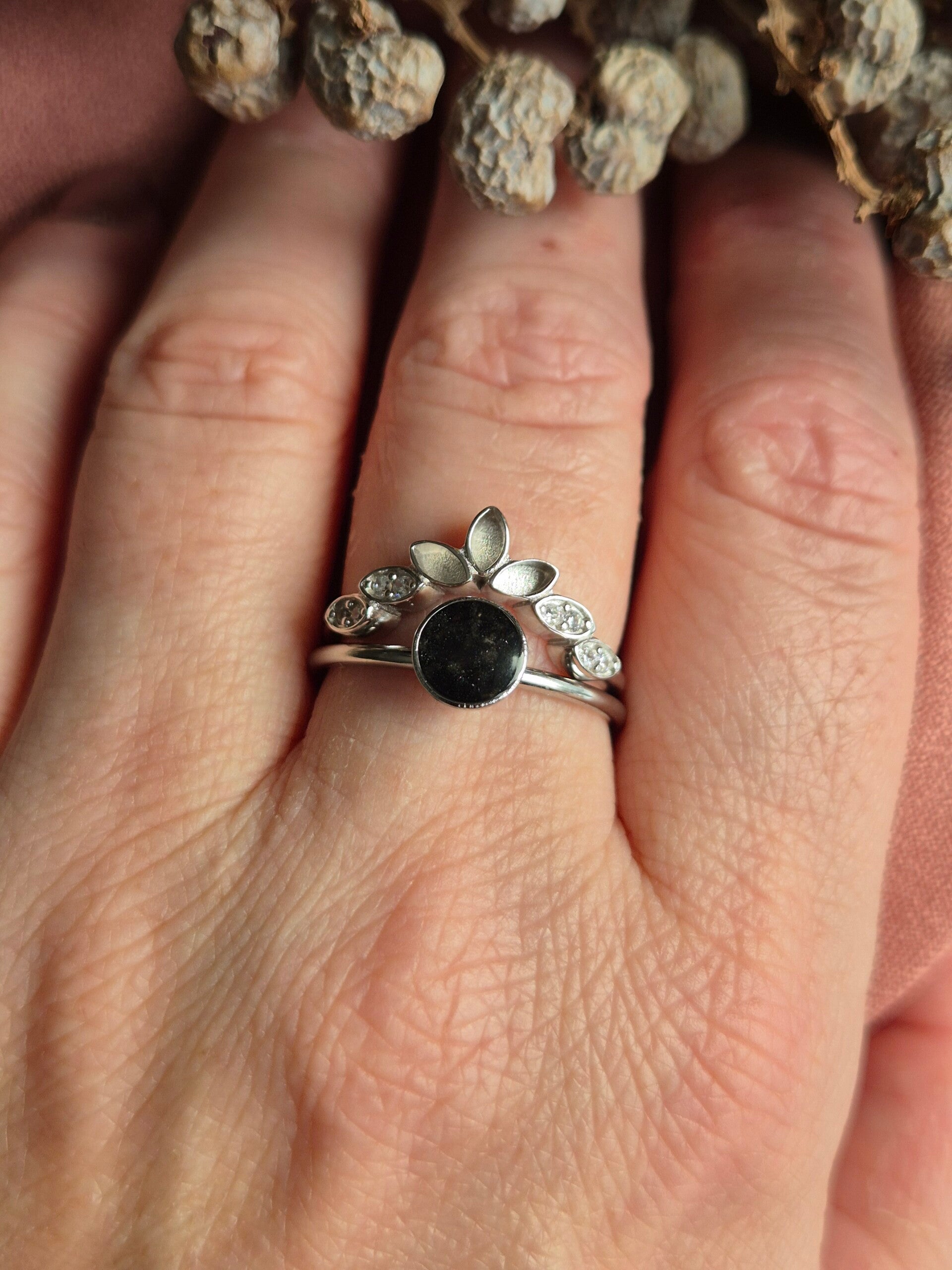 De sterling Zilveren ring is op maat of verstelbaar te bestellen. Deze ring heeft 3 kleine vulbare marquisevorm kamertjes die gevuld kunnen worden met crematie-as, een aantal haartjes/vacht, een klein stukje stof of andere dierbare toevoeging.