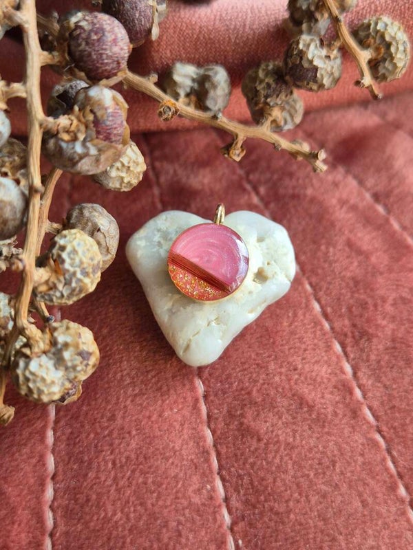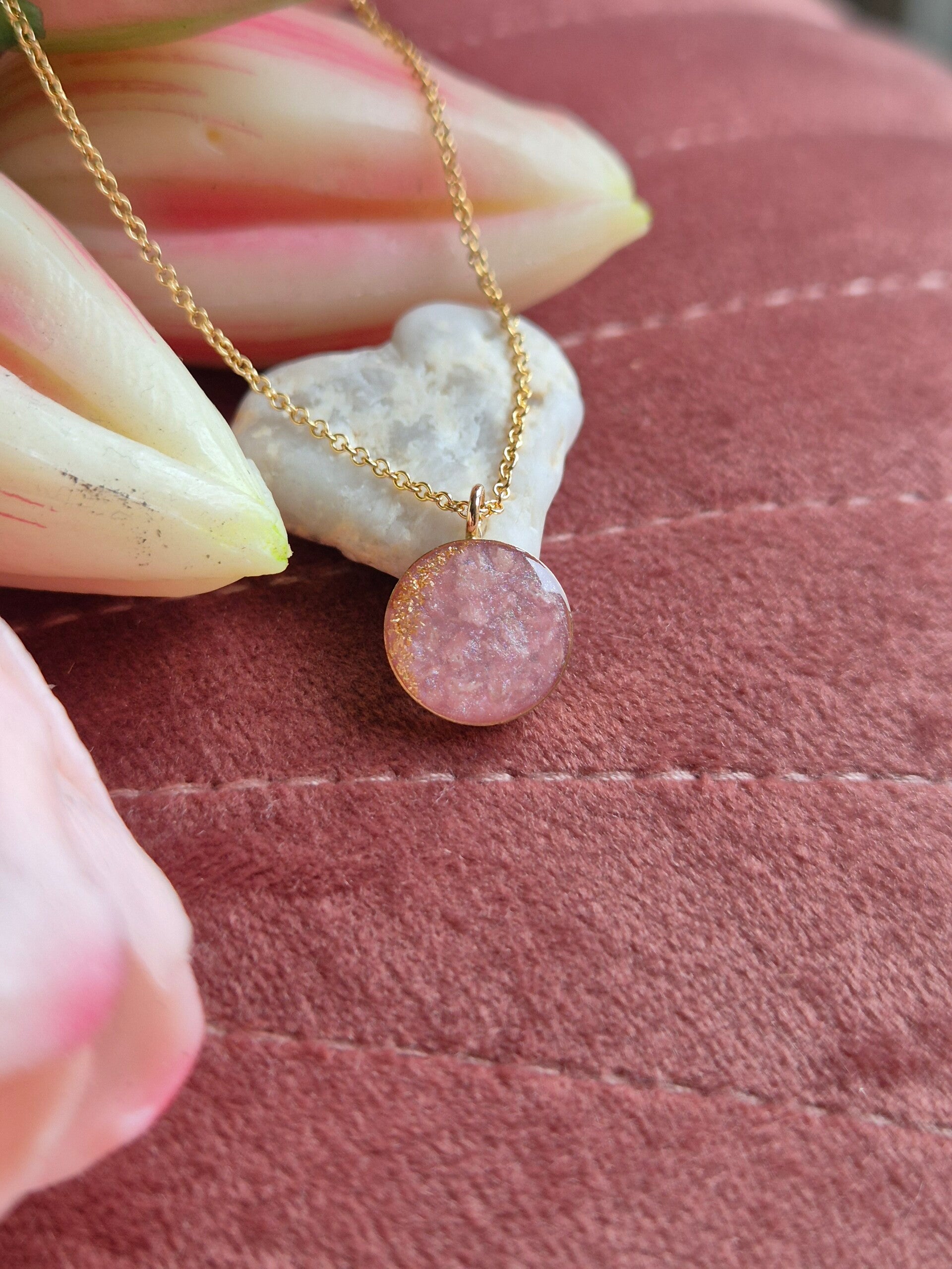 Foto 1 In deze hanger van 10mm zijn witte asdeeltjes geselecteerd en in licht roze parelmoer pigment gelegd. De goudvlokjes zijn ingelegd zoals de maanstand was op zijn geboortedag.